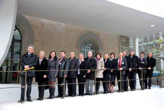 Die Bündner und Liechtensteiner Delegation mit Regierungsrätin Barbara Janom Steiner neben Landtagspräsident Arthur Brunhart und Standespräsident Ueli Bleiker (Mitte) vor dem Eingang des Grossratsgebäudes.