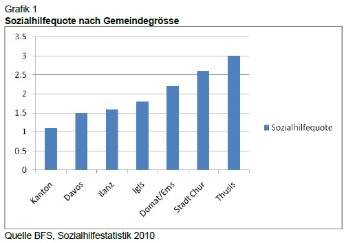 Im Kanton Graubünden weisen Gemeinden mit weniger als 5000 Einwohner/innen Sozialhilfequoten von unter 0.8 Prozent auf. Über der Schwelle von 5000 Bewohner/innen springt die Quote auf 1.6 und mehr Prozent. Die höchsten Sozialhilfequoten lassen sich hauptsächlich in den grossen Gemeinden Davos, Ilanz, Igis, Domat/Ems, der Stadt Chur und Thusis finden (vgl. Grafik 1). Höher als in der Stadt Chur ist die Quote nur in Thusis. Mit fast 3 Prozent liegt diese gut zweieinhalbmal über dem Kantonsdurchschnitt.
