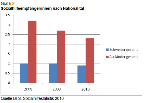Seit 2009 hat die Anzahl Personen mit ausländischem Pass in der Sozialhilfe stark abgenommen. Der Rückgang von gut 800 auf rund 700 Personen entspricht einem Minus von genau 13 Prozent. Bei Personen mit Schweizer Pass fällt der Rückgang der Sozialhilfequote mit 3.4 Prozent um einiges geringer aus. Die Quote der Personen mit ausländischem Pass bleibt trotzdem mehr als doppelt so hoch wie jene der Schweizer/innen (vgl. Grafik 3).