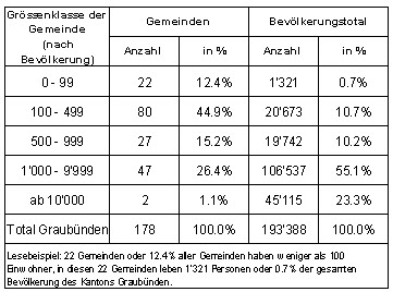 57,3 % aller Bündner Gemeinden zählten 2011 weniger als 500 Einwohner; in diesen kleineren Gemeinden leben insgesamt aber nur noch 11,4 % der ständigen Wohnbevölkerung. Der Konzentrationsprozess auf die grösseren Gemeinden setzt sich fort.