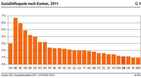 Mit 1,1 Prozent lag die Sozialhilfequote des Bergkantons 2011 um fast zwei Drittel tiefer als jene der Gesamtschweiz (3,0 %). Die umliegenden Kantone Glarus (2,0 %), Appenzell Ausserrhoden (1,8 %) und St. Gallen (2,1 %) hatten jeweils eine höhere Quote. Schweizweit verfügten nur die Kantone Nidwalden (0,9 %), Obwalden (1,2 %) und Uri (1,1 %) über eine ähnlich tiefe Sozialhilfequote. Um einen Vergleich zwischen Graubünden und der restlichen Schweiz ziehen zu können, mussten aus Gründen der Verfügbarkeit Sozialhilfestatistikdaten aus dem Jahre 2011 hinzugezogen werden.