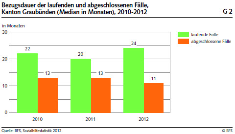 Die Bezugsdauer der laufenden Fälle liegt 2012 bei 24 Monaten (Median). In den Vorjahren lag sie jeweils bei 20 (2011) und 22 Monaten (2010). Über 30 Prozent der laufenden Fälle beziehen bis zu einem Jahr Sozialhilfeleistungen, gut 18 Prozent sind seit einem bis maximal zwei Jahren auf Sozialhilfe angewiesen. Die Bezugsdauer der abgeschlossenen Fälle liegt bei 11 Monaten. In den beiden Vorjahren betrug sie 13 Monate und ist somit leicht gesunken. Über die Hälfte aller abgeschlossenen Fälle bezog höchstens ein Jahr lang Sozialhilfe. Gut 17 Prozent kommen auf einen Bezug von ein bis zwei Jahren.