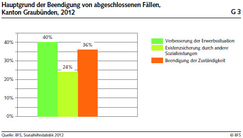 Die Sozialhilfe sichert die Existenz bedürftiger Menschen und fördert deren soziale und berufliche Integration. Ziel ist es, die Bedürftigkeit so rasch als möglich zu beheben und die wirtschaftliche Eigenständigkeit des Individuums nachhaltig wieder herzustellen. Im Kanton Graubünden können fast 40 Prozent aller Fälle kraft einer verbesserten Erwerbssituation aus der Sozialhilfe abgelöst werden. Rund 25 Prozent aller abgeschlossenen Fälle sichern ihre Existenz durch Sozialversicherungsleistungen oder andere bedarfsabhängige Sozialleistungen ab. Und bei gut 35 Prozent wird die Zuständigkeit aufgrund eines Wohnort- oder Sozialdienstwechsels oder aber durch Kontaktabbruch beendet.