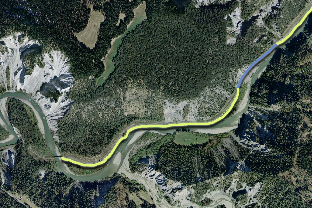 Geplanter Wanderweg (gelb) mit Fussgängertunnel (blau) in der Ruinaulta
