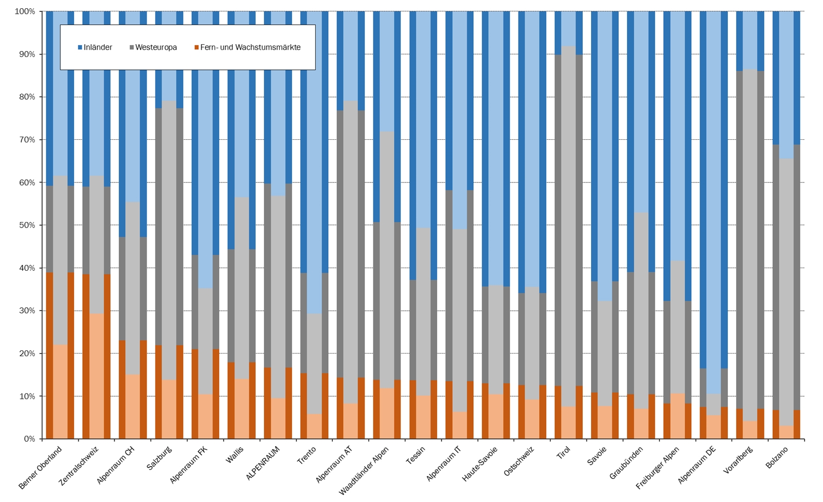 Anhaltende Zuwächse von Gästen aus Fern- und Wachstumsmärkten auf bescheidenem Niveau konnten diese Verluste in Graubünden bis heute bei weitem nicht wettmachen. Gerade im Vergleich zu anderen Schweizer Ferienregionen ist die Internationalisierung noch wenig fortgeschritten. Die steigende Bedeutung des Schweizer Markts für den Bündner Tourismus konnte aufgrund der Schwäche der anderen Märkte ohne grosses eigenes Wachstum erreicht werden.
