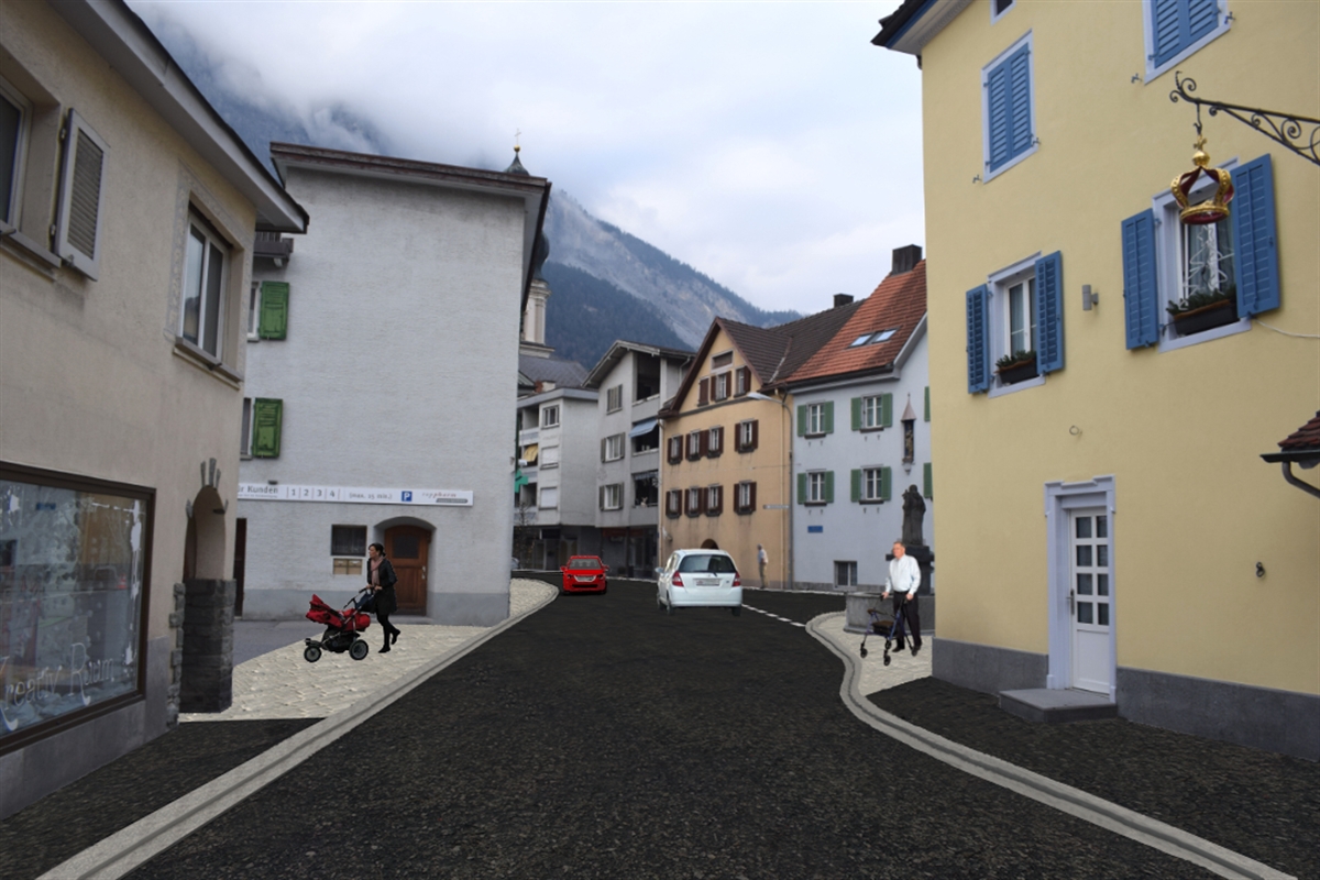 Mit dieser Strassenkorrektur schafft das Tiefbauamt eine sichere durchgehende Fussgängerverbindung und entschärft gleichzeitig die unübersichtlichen Engpässe. Der nicht frostsichere Strassenoberbau wird komplett erneuert und die Strassenanlage optimiert, soweit es die umliegende Dorfstruktur zulässt. Der Ausbau erfolgt mit dem Ziel der bestmöglichen Schonung der vorhandenen Bausubstanz. Der betroffene Abschnitt befindet sich gemäss Zonenplan der Gemeinde Domat/Ems im "Gestaltungsbereich mit erhöhten Anforderungen". Die an die Strasse angrenzenden Plätze werden gepflastert, womit sie sich optisch besser vom Strassenbereich abheben und zur Verschönerung und Aufwertung des Dorfkerns beitragen.