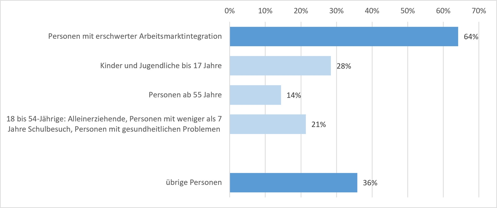 Drei weitere Gruppen sind mit höheren Herausforderungen bei der Integration in den Arbeitsmarkt konfrontiert. An erster Stelle stehen Alleinerziehende, die minderjährige Kinder betreuen. Sie können der geforderten Flexibilität des Arbeitsmarktes teilweise nicht rasch genug entsprechen. So können beispielsweise die fehlende, kurzfristige Verfügbarkeit von Kinderbetreuungsplätzen oder Arbeitszeiten ausserhalb der Zeitfenster der Kinderbetreuungsangebote dazu führen, dass sie in der Stellenwahl zusätzlich eingeschränkt sind. Eine zweite Gruppe besteht aus Personen mit einem tiefen Ausbildungsgrad, die also weniger als sieben Jahre Schulzeit absolviert haben. Für diese Personen, welche nicht über die notwendige Grundbildung verfügen, ist es äusserst schwer in den Arbeitsmarkt, der zunehmend hochspezialisierte Fachkräfte verlangt, einzutreten. An dritter Stelle steht eine gemischte Gruppe, welche unter anderem aus gesundheitlichen Gründen geringe Chancen auf dem Arbeitsmarkt hat, bei der aber trotzdem kein Anspruch auf Unterstützung durch die Invaliditätsversicherung besteht (z.B. bei Suchterkrankungen). Zusammen machen diese drei Gruppen im Jahr 2017 21 Prozent der Sozialhilfebeziehenden im Kanton Graubünden aus. Personen dieser Gruppen sind durchschnittlich gut drei Jahre auf Sozialhilfe angewiesen.
