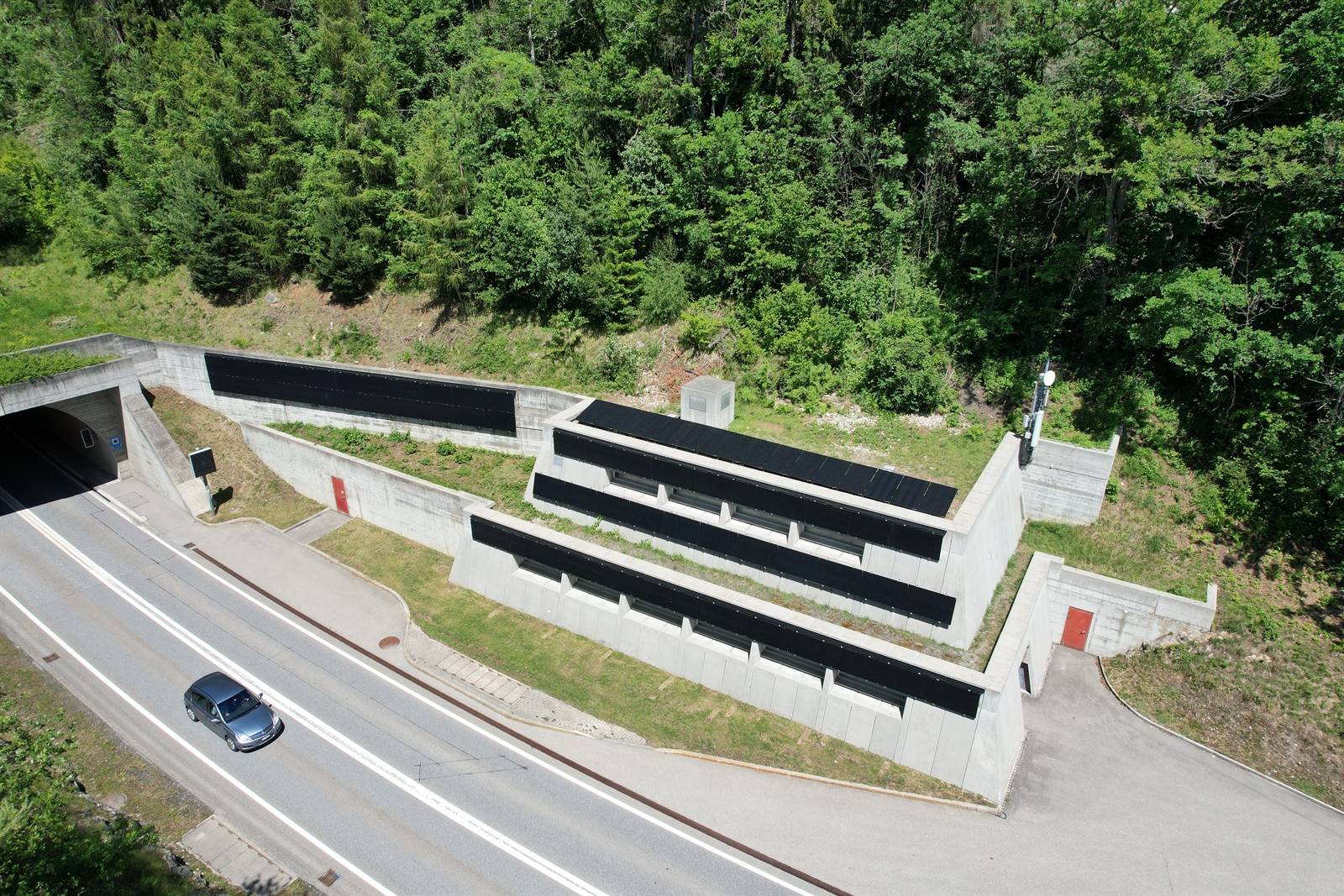Seit Mitte Juni wird die Betriebs- und Sicherheitsausrüstung des Tunnels Trin an der Oberalpstrasse H19 teilweise mit Solarstrom betrieben. Erzeugt wird dieser von einer neu erstellten Anlage beim Ostportal des Tunnels. Dieser Standort bietet bezüglich Sonneneinstrahlung und Montagemöglichkeiten für die Solarpanels ideale Voraussetzungen. Insgesamt konnten 72 Module mit einer Gesamtfläche von 130 Quadratmetern installiert werden. Diese produzieren jährlich rund 21 000 Kilowattstunden Strom, was dem durchschnittlichen Jahresverbrauch von sechs Einfamilienhäusern entspricht. Insgesamt lassen sich damit rund sechs Prozent des jährlichen Energieverbrauchs des Tunnels abdecken.