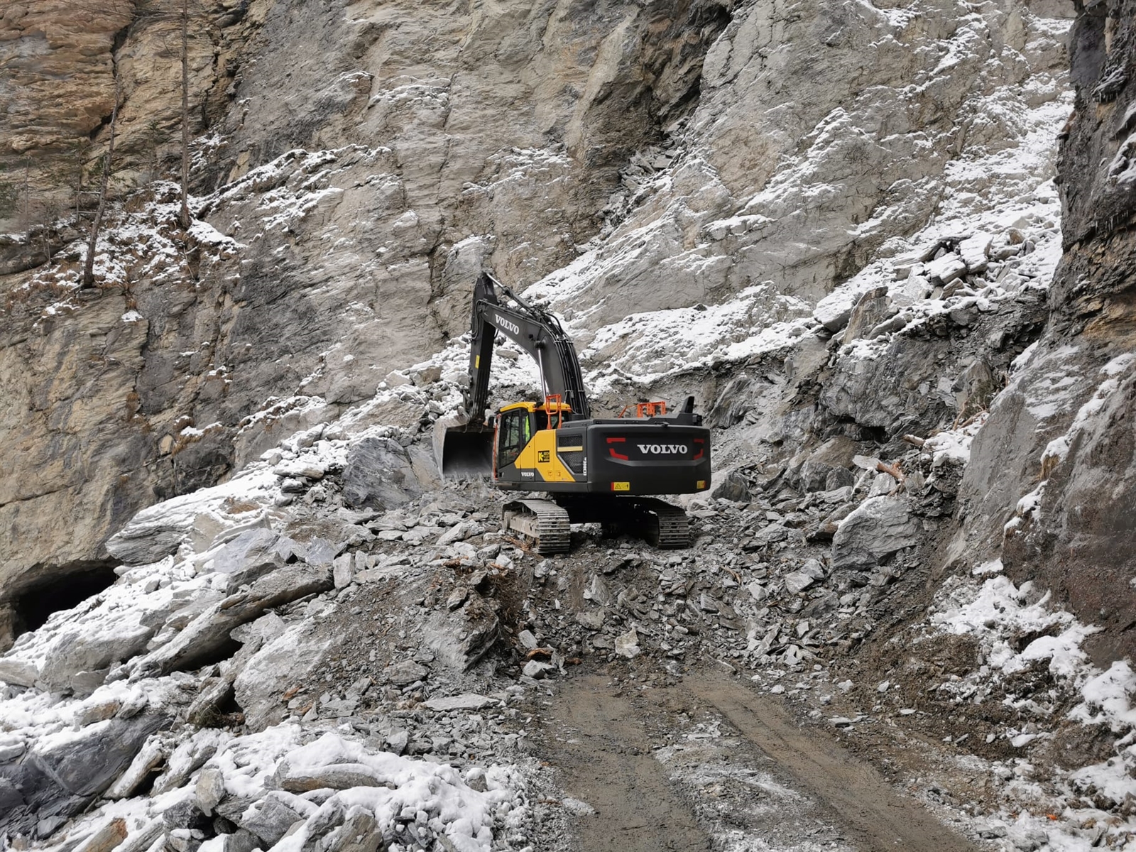 Bereits Ende 2023 wurde mit der Felsräumung begonnen, um das lose Gesteinsmaterial im Ausbruchgebiet zu entfernen. Die Felsräumung wurde in der Zwischenzeit abgeschlossen. Aktuell ist die maschinelle Räumung der Sturzablagerung auf der alten Samnaunerstrasse im Gange. Bis Ende der ersten Januarwoche wurden über 3500 Tonnen Material abtransportiert.