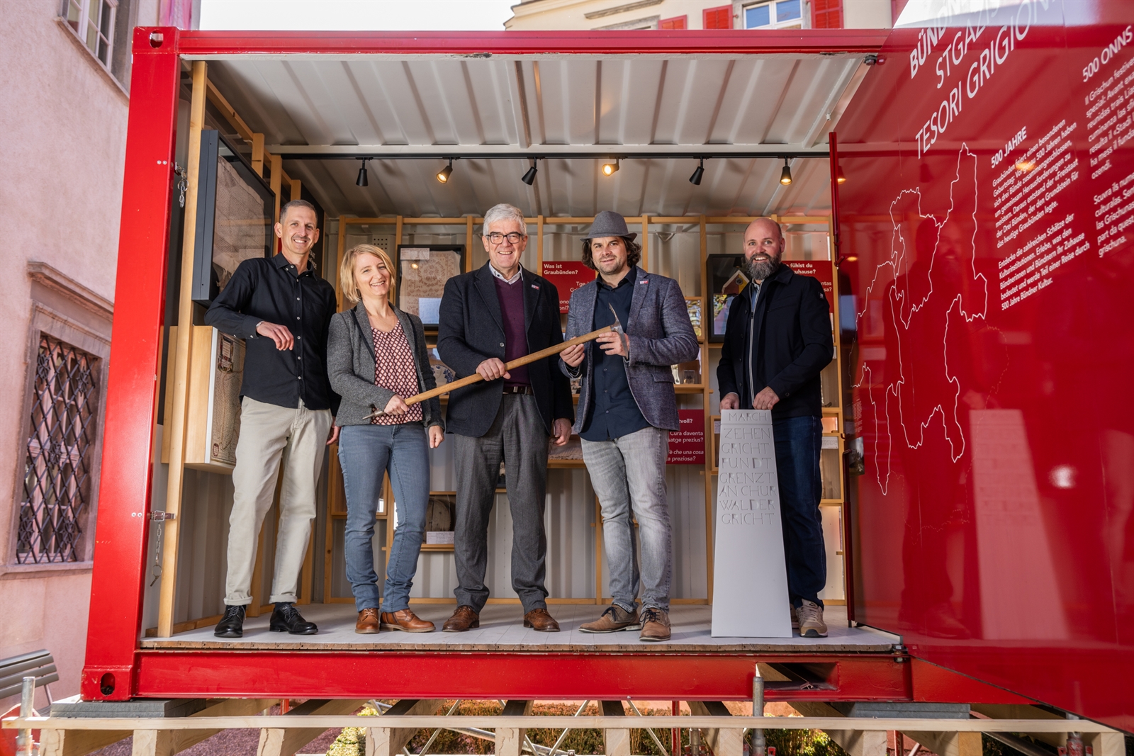 Das mobile Mini-Museum, ausgestattet mit einem Faksimile des Bundsbriefs vom 23. September 1524, Kartenmaterial und einer Chronologie zur Geschichte des Dreibündenstaates, einem überdimensionalen Setzkasten mit den Leihgaben und der, an der Aussenseite des Containers präsentierten Bildergalerie mit geschichtsträchtigen Objekten aus Bündner Archiven und Museen, begeisterte auf seiner Tournee an 12 Stationen Gäste und Einheimische gleichermassen. Während ihrer Reise durch Graubünden wurde die Wanderausstellung von einem abwechslungsreichen Rahmenprogramm begleitet. Der Container steht nun im Rahmen der Ausstellung «verbündet und verbunden» vor dem Rätischen Museum und kann während den Museumsöffnungszeiten noch bis Ende März 2025 besichtigt werden. Im Anschluss an die Ausstellung, also ab Ende März 2025, kann der Container erworben werden. Interessenten melden sich bis 1. Dezember 2024 mit konkreten Vorstellungen an info@500.gr.ch.