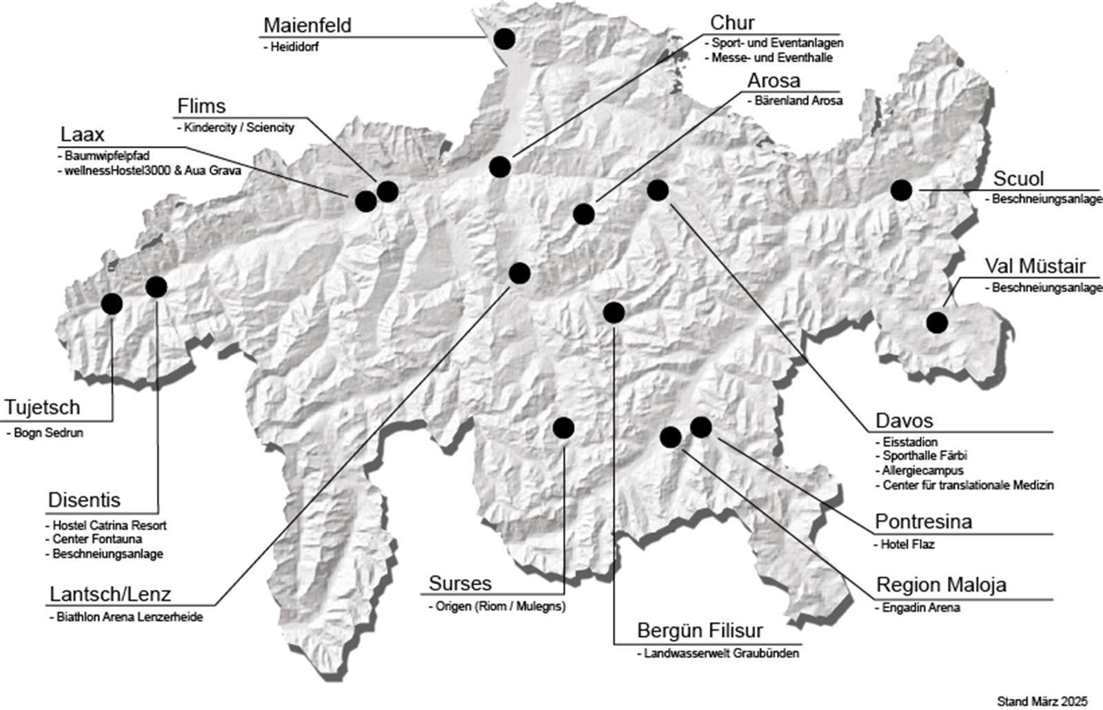 Die bisher zugesicherten Kantonsbeiträge an systemrelevante Infrastrukturen betreffen verschiedene Gemeinden und Regionen im Kanton Graubünden (siehe Abbildung).