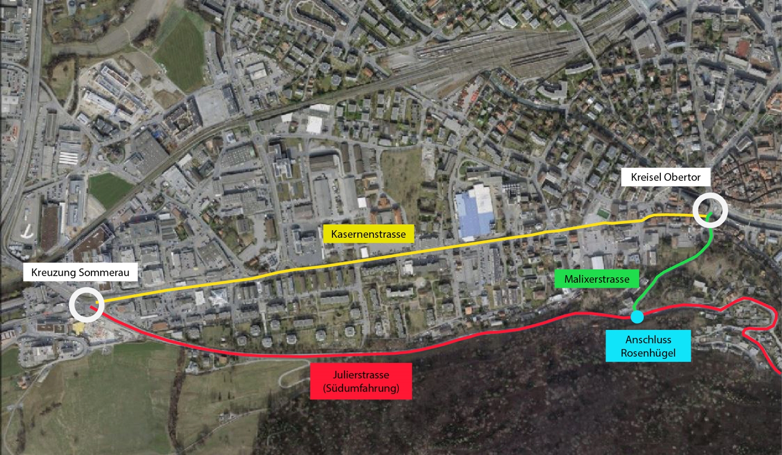 Der bestehende Anschluss Rosenhügel wird zu einem Knoten mit Lichtsignalanlage umgestaltet. Der vom Autobahnanschluss Chur Süd kommende Verkehr kann künftig via Umfahrung Süd, Malixerstrasse und Obertor direkt in Richtung Stadtzentrum geführt werden.