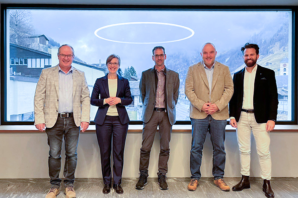 Auf dem Foto v.l.n.r.: Stefan Schmid, Präsident Korporation der Konzessionsgemeinden der KWZ AG, Dr. Carmelia Maissen, Regierungsrätin, Vorsteherin des Departements für Infrastruktur, Energie und Mobilität, Daniel Berni, Vorstandsmitglied Korporation der Konzessionsgemeinden der KWZ AG, Thomas Schmid, Leiter Amt für Energie und Verkehr Kanton Graubünden, Lic. iur. Conradin Luzi, Caviezel Partner