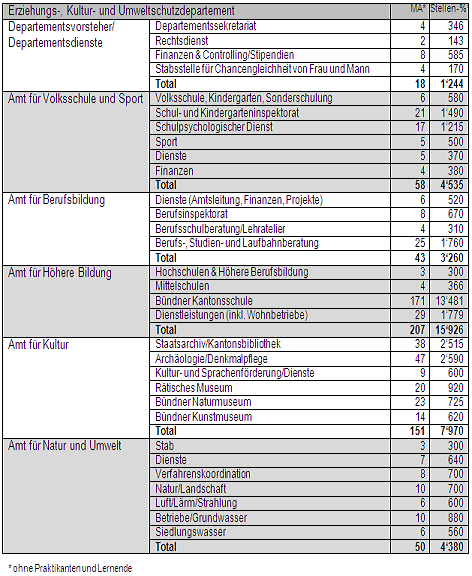 Trotz der grossen Bedeutung des Sports fristet graubünden sport organisatorisch ein Mauerblümchendasein. graubünden sport bildet innerhalb des Erziehungs-, Kultur- und Umweltschutzdepartements eine blosse Abteilung Sport im Amt für Volksschule und Sport. Dies im Gegensatz zu früher, als der Kanton Graubünden noch ein Sportamt hatte. Damit werden zwei falsche Signale gesendet: Zum einen befindet sich graubünden sport hierarchisch auf der untersten kantonalen Stufe. Zum anderen wird graubünden sport im Bereich Volksschule positioniert.