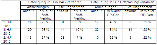 Aus dieser Tabelle ergibt sich, dass die USO in knapp 10% der BAB-Fälle und in ca. 25% der Ortsplanungen eigentliche Stellungnahmen einreichen. Inwiefern sich dies auf die Verfahrensfristen auswirkt, wurde nicht evaluiert. Ressourcenrelevant ist eine Verfahrensbeteiligung jedenfalls nicht erst dann, wenn sie in eine Stellungnahme mündet, sondern auch bereits dann, wenn sie im Zuge der Akteneinsichtnahme zu spezifischen Projekterläuterungsgesprächen zwischen Amt und USO führt.