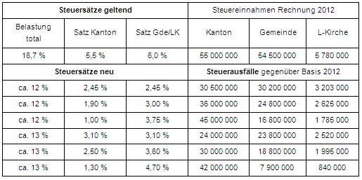 Der Vergleich von Gewinnsteuern basiert auf der effektiven Steuerbelastung, welche der Abziehbarkeit der Gewinnsteuern als geschäftsmässig begründeter Aufwand Rechnung trägt. Für Graubünden beträgt diese heute für alle Gewinnsteuern (Bund, Kanton, Gemeinden und Landeskirchen) 16,7 % und soll auf 12 % oder 13 % reduziert werden. Die Mindereinnahmen soll hauptsächlich der Kanton tragen, weshalb verschiedene Konstellationen mit unterschiedlicher Lastenverteilung möglich sind:
