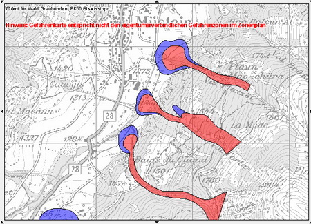 Die Gefahren durch Lawinen, Hochwasser, Steinschlag und Rutschung werden in Gefahrenkarten festgehalten. Sie werden für den Siedlungsbereich ausgeschieden. Soweit sie bereits digital vorhanden sind, können sie im Mapservice des Kantons eingesehen werden.