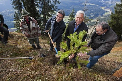 Regierungsrat Dr. Mario Cavigelli, der Gemeindepräsident von Trin, Hans Telli, und der Stiftungsratspräsident der Stiftung Bergwaldprojekt, Alan E. Kocher, pflanzen gemeinsam eine Föhre im Schutzwald von Trin.