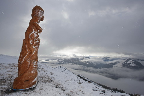 Lunghi, die Holzskulptur, die aus Anlass des 25 jährigen Jubiläums des Bergwaldprojekts geschaffen und auf die Alp über Trin aufgestellt wurde, wacht über den Schutzwald