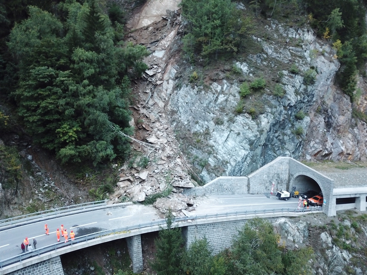 Nach der ersten Gefahrenbeurteilung konnte bereits am Montagnachmittag mit den ersten Räumungsarbeiten begonnen werden. Am Abend wurde eine einfache Vermessung eingerichtet. Diese bestätigte heute Morgen, dass im Anrissbereich noch eine Felsmasse von schätzungsweise über 1000 Kubikmetern aktiv in Bewegung ist. Die Felsmasse ist absturzgefährdet und muss daher vor einer Öffnung der Strasse abgetragen werden.