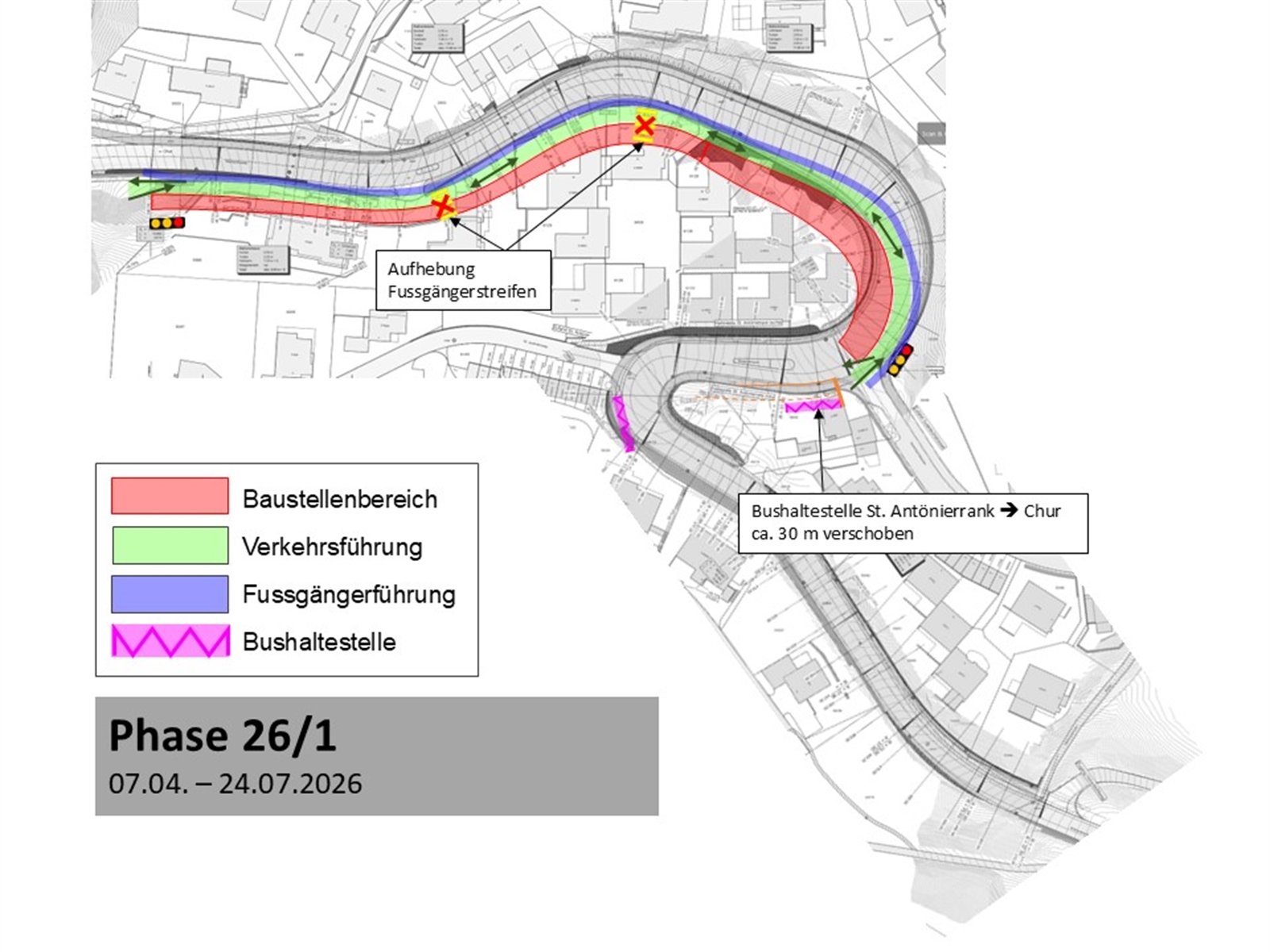 Die Bushaltestelle St. Antönierrank in Fahrtrichtung Chur wird während den Bauarbeiten der ersten Bauphase ca. 30 Meter stadtauswärts verschoben. In der zweiten Bauphase ab ca. Mitte August 2026 werden beide Bushaltestellen «St. Antönierrank» ca. 40 m unterhalb der Susenbühlstrasse provisorisch eingerichtet.