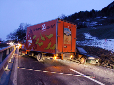 Ein in Richtung Flims fahrender Lieferwagenlenker überholte oberhalb Tamins einen Lastwagen. Ein entgegenkommender Personenwagenlenker bremste sein Fahrzeug brüsk ab, weil er der Meinung war, dass der Fahrer des Lieferwagens nicht mehr rechtzeitig auf seine Fahrbahn zurückkehren könne. Wegen des Bremsmanövers geriet der Personenwagenlenker jedoch seinerseits ins Rutschen und kam auf die Gegenfahrbahn. Darauf reagierte der Lieferwagenlenker, der inzwischen wieder auf seiner Fahrspur war, mit einem Ausweichmanöver auf die linke Fahrbahnhälfte. Quasi im Linksverkehr kollidierten die beiden Fahrzeuge schliesslich frontal-seitlich miteinander. Der Personenwagenlenker wurde dabei leicht verletzt. Er wurde mit der Ambulanz ins Kantonsspital Chur gefahren. An beiden Fahrzeugen entstand erheblicher Sachschaden.