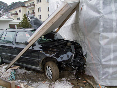 Der 24-Jährige fuhr auf der alten Kantonsstrasse von Celerina Richtung Samedan. Auf der Höhe des Sporthotels geriet er in einer Rechtskurve auf die Gegenfahrbahn und anschliessend auf das Trottoir. Nachdem das Fahrzeug einen Zaun durchbrochen hatte, wurde es von einem Baustellengerüst gestoppt und total beschädigt. Der Lenker blieb unverletzt. Gemäss eigenen Angaben musste er einem entgegenkommenden Fahrzeug ausweichen und war selber mit überhöhter Geschwindigkeit unterwegs. Ein Atemlufttest ergab einen Alkoholwert von 2,1 Promille. Zudem gab der Lenker an, am Morgen einen Joint geraucht zu haben. Die Kantonspolizei Graubünden ordnete im Spital Samedan eine Blut- und Urinprobe an und nahm dem 24-Jährigen den Führerausweis an Ort und Stelle ab.