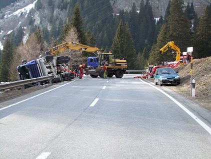 Der Chauffeur des mit Aushubmaterial voll beladenen Sattelmotorfahrzeugs war von Silvaplana in Richtung Casaccia unterwegs. Sein Auftrag war, das Material zum Kieswerk Casaccia zu bringen. Ausgangs einer starken Linkskurve kurz vor Casaccia wurde das Fahrzeug wegen der Fliehkraft instabil, kippte und stürzte auf die Leitplanke am rechten Strassenrand. Die ganze Ladung ging dabei verloren. Dem Chauffeur gelang es, selbst aus der Führerkabine zu klettern und die Polizei zu verständigen.