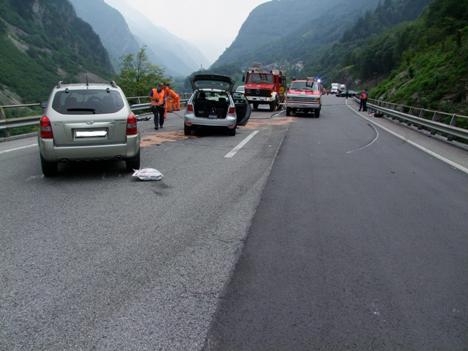 Sulla tratta Castello di Mesocco - Ponte di Giusné un’automobilista diretto a nord iniziava a sorpassare un autopostale, mentre stava sopraggiungendo del traffico in senso inverso. Nel tentativo di evitare uno scontro, l’automobilista sterzava a sinistra. Dopo una collisione laterale con un veicolo proveniente da nord, la macchina finiva con cozzare contro il guardrail sinistro. Successivamente collideva frontalmente con una seconda vettura proveniente da nord. Nello scontro cinque persone riportavano ferite di vario grado. Tre dei feriti sono stati trasportati con due ambulanze ed un elicottero della Rega all’Ospedale San Giovanni di Bellinzona. Due sono ricorsi alle cure di un medico del posto. Praticamente distrutte le tre auto coinvolte.