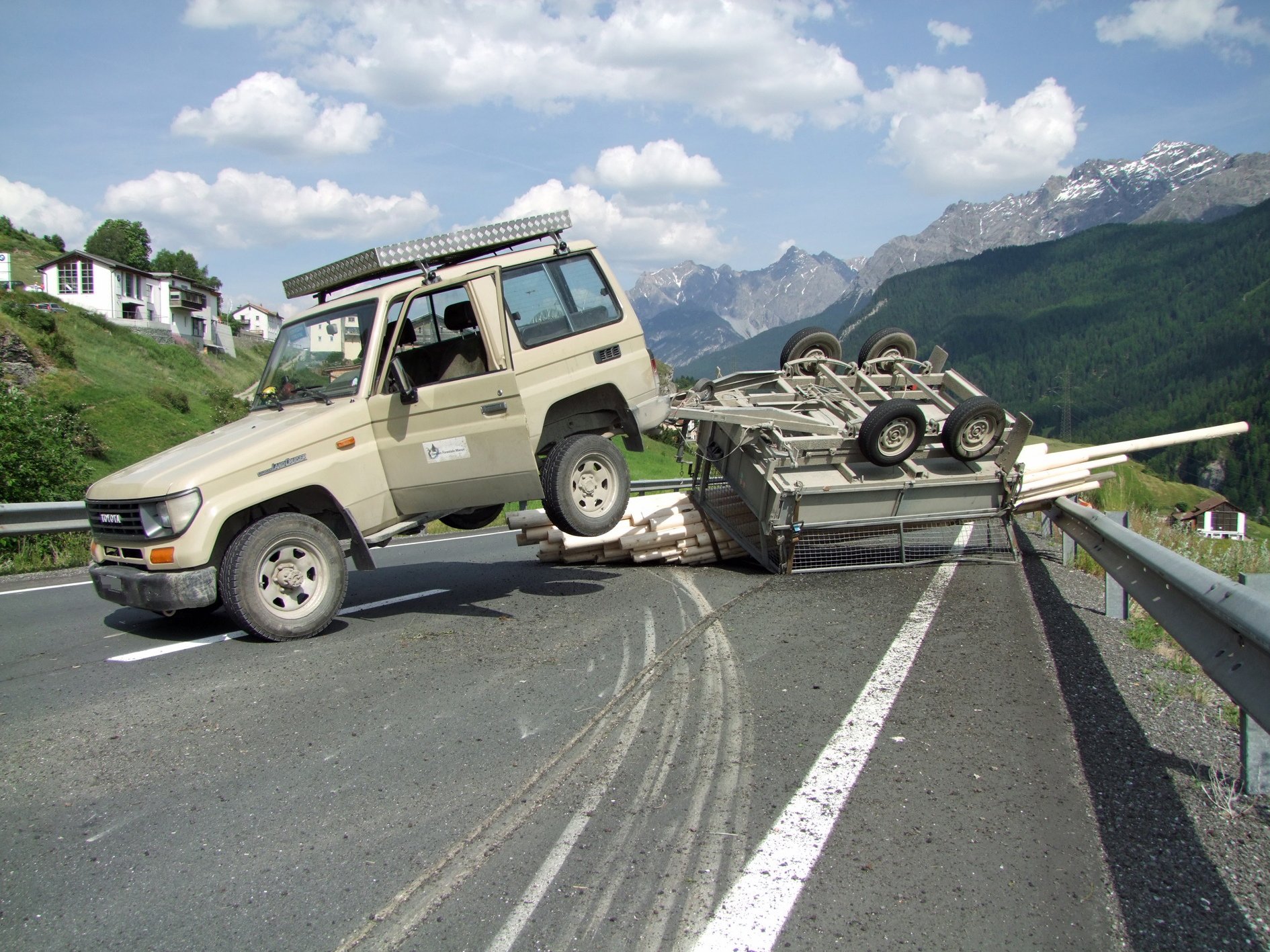 Der 27-jährige Lenker eines Geländewagens hatte auf seinem Anhänger rund 50 Rundholz-Latten geladen. Aus noch unbekannten Gründen geriet der Anhänger plötzlich ins Schlingern. Der Fahrer versuchte nach eigenen Angaben, die Situation wieder in den Griff zu bekommen, was ihm aber nicht gelang. In der Folge brach der Anhänger hinten aus und riss die gesamte Fahrzeugkomposition mit sich. Während dieser Drehung kippte der Anhänger mit den Zaunlatten um, das Zugfahrzeug blieb auf den Rädern. Der Fahrer wurde nicht verletzt, am Fahrzeug und an der Fahrbahn entstand ein Sachschaden von rund 5000 Franken. Während der Räumung der Unfallstelle war die Strasse nur einspurig befahrbar.