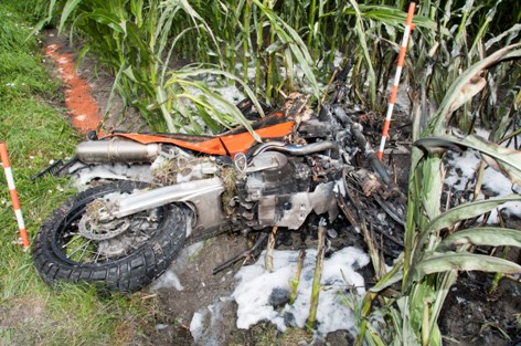 Der Unfall hat sich bei der Abzweigung nach Trimmis ereignet. In einer langgezogenen Kurve geriet ein in Richtung Zizers fahrender Töfffahrer auf die Gegenfahrbahn und kollidierte mit einem entgegenkommenden Auto. In den Unfall wurde auch ein Velofahrer verwickelt. Nach dem Aufprall fing der Töff Feuer und landete neben dem Strassenrand in einem Maisfeld. Bei der heftigen Kollision sind insgesamt vier Personen verletzt worden. Der Töfffahrer und der Velofahrer erlitten mittelschwere bis schwere Verletzungen und wurden ins Kantonsspital Graubünden transportiert. Zwei Insassen des Personenwagens zogen sich leichte Verletzungen zu und wurden ebenfalls ins Kantonsspital Graubünden nach Chur eingeliefert. Der genaue Unfallhergang ist Gegenstand der eingeleiteten polizeilichen Ermittlungen. Vor Ort standen, neben den Polizeikräften, die Strassenrettung Chur, die Rettung Chur und eine Ambulanz vom Spital Schiers im Einsatz.
