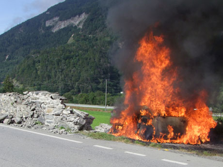 Der 28-jährige Mann fuhr von Trimmis Richtung Chur. Auf einem geraden Teilstück der Deutschen Strasse prallte er frontal in eine Steinmauer am rechten Fahrbahnrand. Dabei wurde der Mann verletzt. Die Rettung Chur betreute ihn notfallmedizinisch neben dem Fahrzeug, als dieses in Brand geriet. Die Feuerwehr der Stadt Chur rückte mit zwölf Personen aus und konnte das Feuer rasch löschen. Der Verunfallte wurde mit unbestimmten Verletzungen ins Kantonsspital Graubünden gefahren. Das Fahrzeug brannte vollständig aus. Die Deutsche Strasse musste zwischen Chur und Trimmis für rund eine Stunde gesperrt werden.