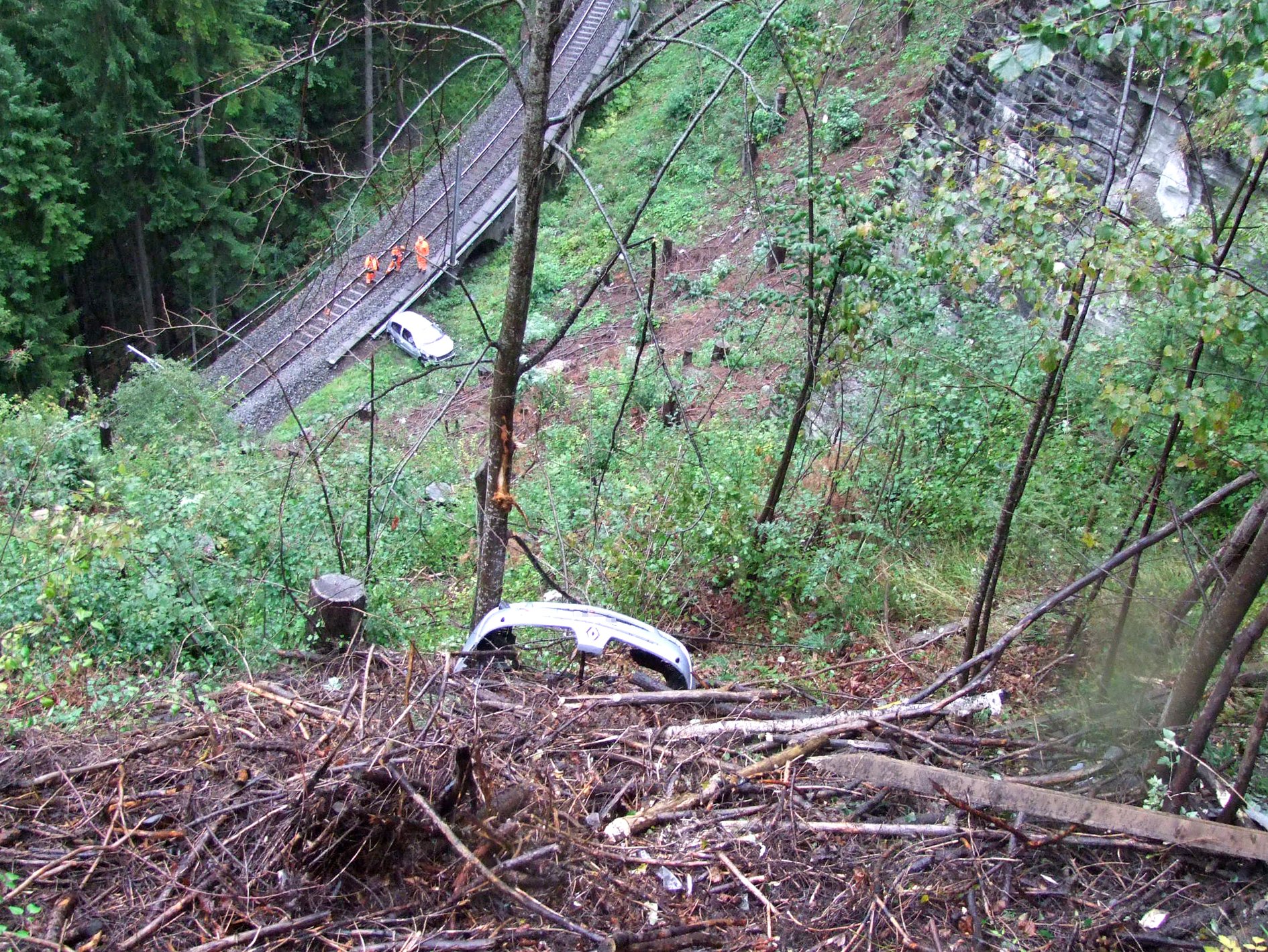 Auf der Fahrt von Tiefencastel Richtung Thusis verlor der 21-Jährige in einer Rechtskurve die Herrschaft über sein Fahrzeug. Er durchbrach einen Bündner Zaun und stürzte rund 200 Meter in ein Tobel hinunter. Dabei streifte das Fahrzeug Bäume und Sträucher und kam kurz vor dem Gleis der Rhätischen Bahn zum Stillstand. Der Fahrer konnte sich selber aus dem Auto befreien. Als ein RhB-Güterzug vorbeifuhr, stand der Mann gemäss Aussage des Lokomotivführers wartend neben seinem Fahrzeug. Kurzerhand nahm er ihn im Führerstand bis zum Bahnhof Solis mit und übergab ihn dort der Ambulanz Thusis. Diese brachte ihn ins Kantonsspital Graubünden nach Chur. Der 21-Jährige hatte wohl mehrere Schutzengel an Bord, denn er blieb - abgesehen von Schürfungen und Prellungen - weitgehend unverletzt. Das total beschädigte Fahrzeug konnte von der Strasse her nicht geborgen werden, sondern musste mit einem Dienstzug der RhB nach Thusis transportiert werden. Der Zugverkehr der Rhätischen Bahn war durch diesen Unfall nicht eingeschränkt.