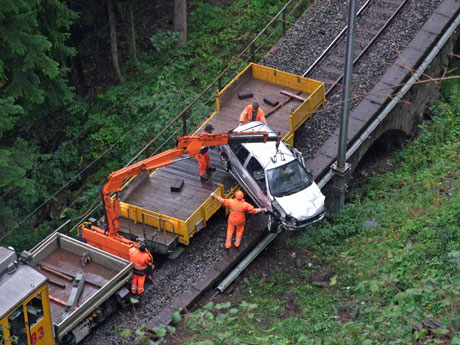 Mit einem Dienstzug der RhB wurde das Fahrzeug nach Thusis transportiert.