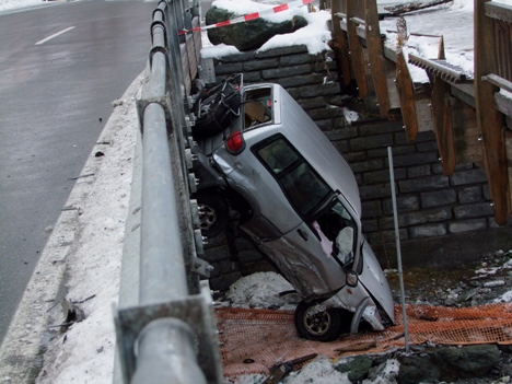 Ausgangs einer Linkskurve auf der Höhe Ravaisch geriet ein Automobilist mit seinem Fahrzeug ins Schleudern. Nachdem das Auto in die Leitplanke einer Brücke geprallt war, wurde es über die Leitplanke katapultiert. Der Personenwagen kam mit der Front im Schergenbach zum Stillstand. Der Lenker, der allein unterwegs war, blieb unverletzt. Da der durchgeführte Atemlufttest positiv ausfiel, wurde eine Blutprobe angeordnet. Am Auto entstand Totalschaden.