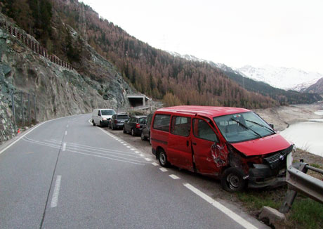 Der Lenker eines Lieferwagens fuhr vom Engadin über den Julierpass in Richtung Savognin. Kurz nach 5 Uhr kam ihm auf der Höhe des Marmorerasees nach eigener Aussage ein Personenwagen entgegen, der über der Leitlinie fuhr. Aus diesem Grund wich der 47-Jährige nach rechts aus und kollidierte in der Folge mit der Stützmauer. Durch die Wucht des Aufpralls wurde das Fahrzeug nach links über die Fahrbahn und in die Leitplanke geschleudert. Der Lenker blieb unverletzt, sein Lieferwagen erlitt jedoch Totalschaden. Auch die Leitplanke wurde auf einer Länge von mehreren Metern erheblich beschädigt.