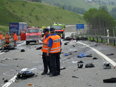 Eine Gruppe von acht Motorradfahrern aus England fuhr von Süden in Richtung Norden. Auf der Höhe von Medels kam ihnen ein deutscher Motorradlenker entgegen. Aus noch nicht geklärten Gründen kollidierte der deutsche Zweiradlenker frontal mit der englischen Gruppe. Die Kollisionsstelle befand sich in der Mitte der nicht richtungsgetrennten Autostrasse. Bei den Todesopfern handelt es sich um einen 50- und einen 55-jährigen Mann aus England. Ein weiteres Mitglied der Achtergruppe sowie der entgegenkommende Mann aus Deutschland wurden schwer verletzt. Die Rega brachte sie ins Kantonsspital Graubünden nach Chur. Die fünf unverletzt gebliebenen Engländer wurden nach Nufenen in ein Lokal begleitet, wo sie von Mitarbeitern des Care Team Grischun psychologisch betreut wurden.