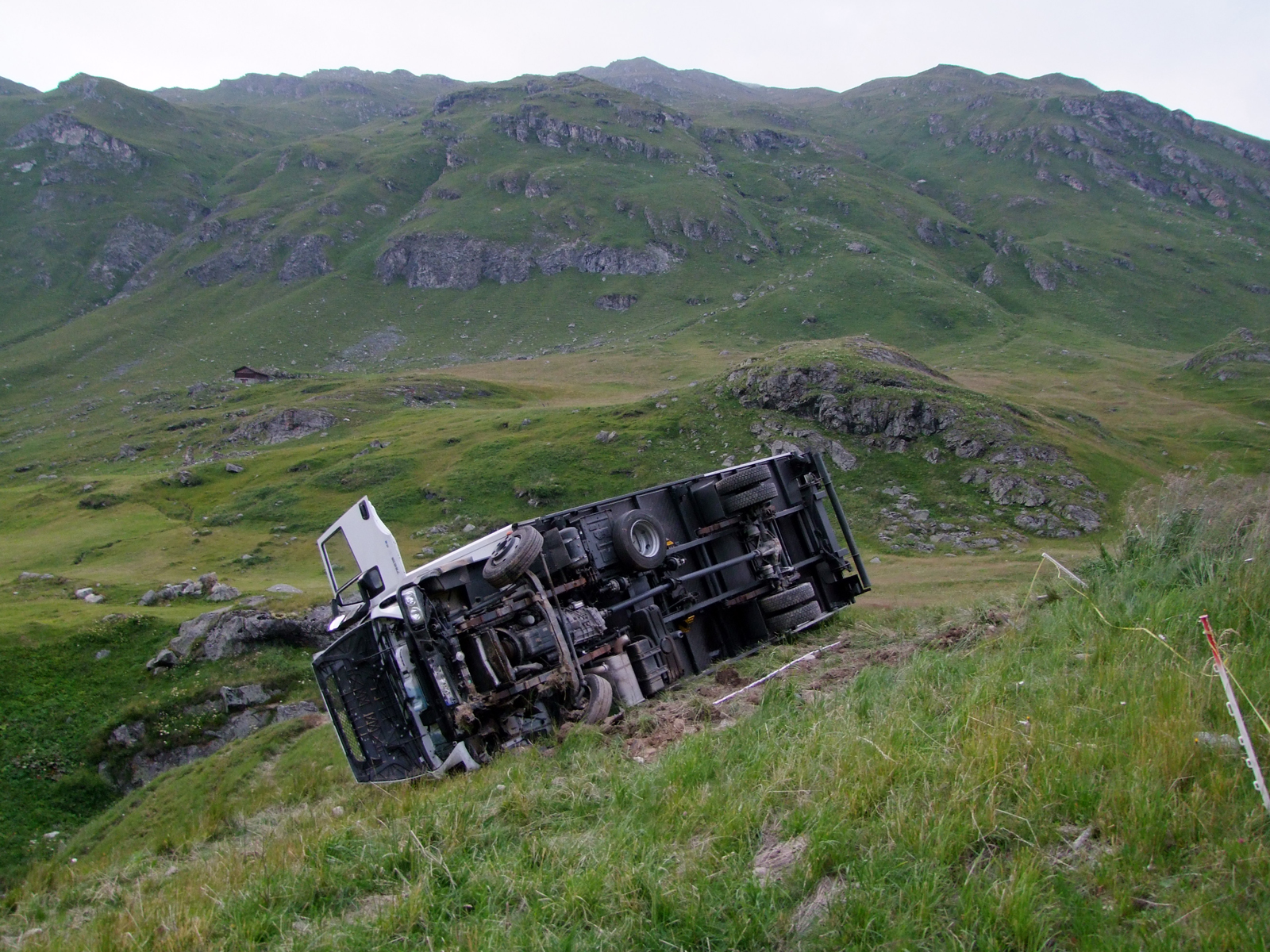 Der Chauffeur fuhr von der Julierpasshöhe in Richtung Bivio. Im Gebiet Mot kippte der Lastwagen in einer Linkskurve nach rechts um und kam von der Strasse ab. Rund zehn Meter neben der Fahrbahn kam das Fahrzeug stark beschädigt auf der Seite liegend zum Stillstand. Abgesehen von ein paar Schürfungen blieb der Lenker unverletzt.