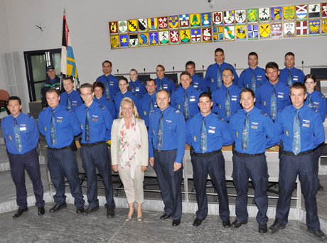 Las 5 novas posizistas ed ils 15 novs polizists da la polizia chantunala dal Grischun cun lur emprims lieus da staziunament: