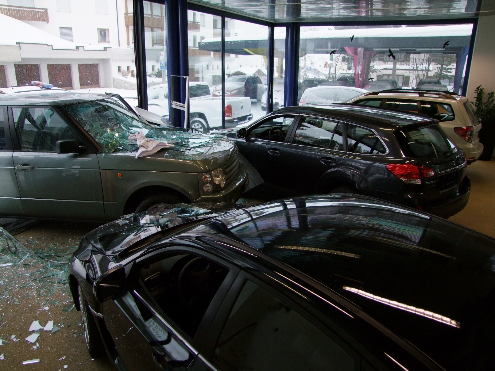 Mit der Absicht seinen Wagen in Reperatur zu bringen, wollte der Automobilist sein Fahrzeug (Automat) vor der Autogarage abstellen. Beim Parkieren rutschte er mit seinem Fuss vom Brems- und betätigte unglücklich das Gaspedal. In der Folge durchschlug sein Auto die Schiebeglastüre, prallte gegen zwei in der Ausstellungshalle abgestellten Fahrzeuge und kam im Innern zum Stillstand.