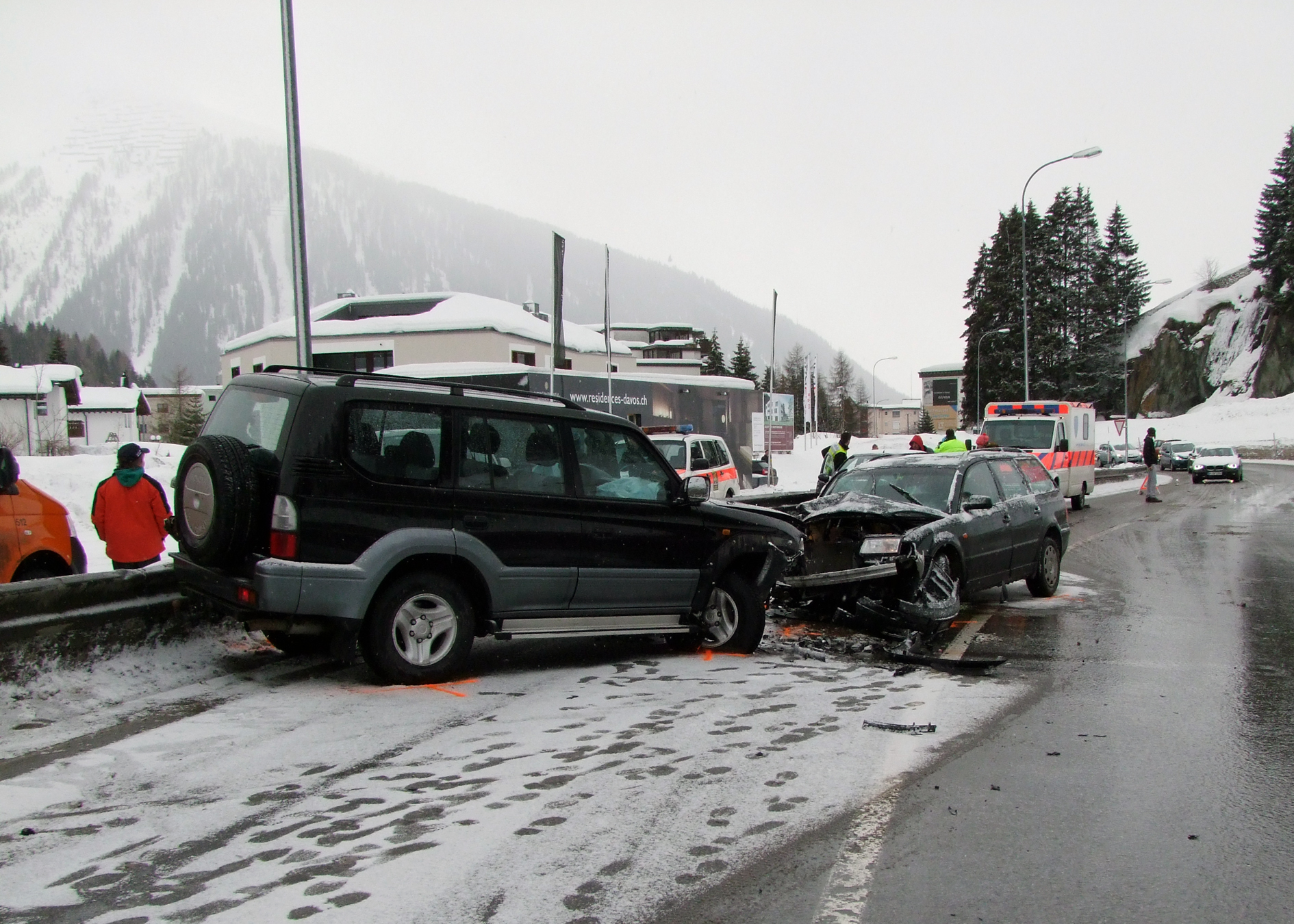 Die Lenkerin eines Personenwagens fuhr zusammen mit einer Beifahrerin von Klosters nach Davos. Auf der Höhe des Davosersees, direkt nach der Salezer Galerie, kam das Fahrzeug auf der schneebedeckten Strasse ins Rutschen und geriet auf die Gegenfahrbahn. Dort kollidierte es zuerst seitlich mit dem ersten entgegenkommenden Personenwagen und anschliessend frontal mit einem zweiten. Insgesamt wurden fünf Personen leicht verletzt: Die Beifahrerin des Fahrzeugs, das ins Schleudern geraten war, die Lenkerin des ersten entgegenkommenden Fahrzeugs und drei der vier Insassen aus dem zweiten Fahrzeug. Die Ambulanz brachte alle fünf ins Spital Davos. An den Fahrzeugen entstand erheblicher Sachschaden. Während der Unfallaufnahme war die Strasse nur einspurig befahrbar.