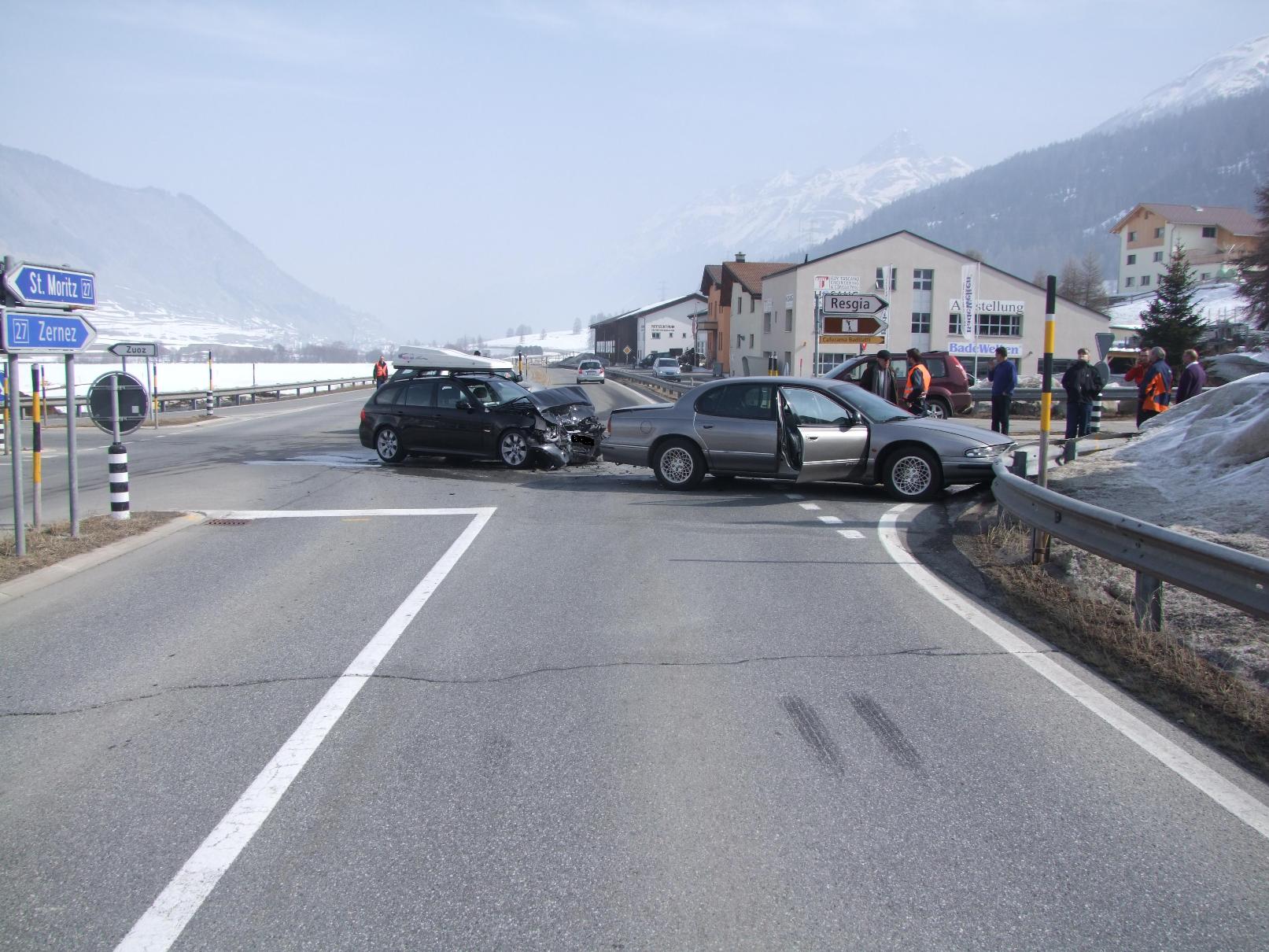 Ein 84-jähriger Fahrzeuglenker beabsichtigte bei der Resgia-Kreuzung mit seinem Personenwagen von Zuoz kommend in Richtung Zernez zu fahren. Als er auf die Hauptstrasse einbog, fuhr von Zernez kommend ein Personenwagenlenker auf der Hauptstrasse 27 in Richtung St. Moritz. Dieser kollidierte frontal mit der Seite des einbiegenden Fahrzeuges. Beim heftigen Zusammenstoss wurden zwei Beifahrer leicht verletzt und durch die Rettung Oberengadin mit zwei Ambulanzfahrzeugen ins Spital Oberengadin nach Samedan überführt. An beiden Fahrzeugen entstand erheblicher Sachschaden.