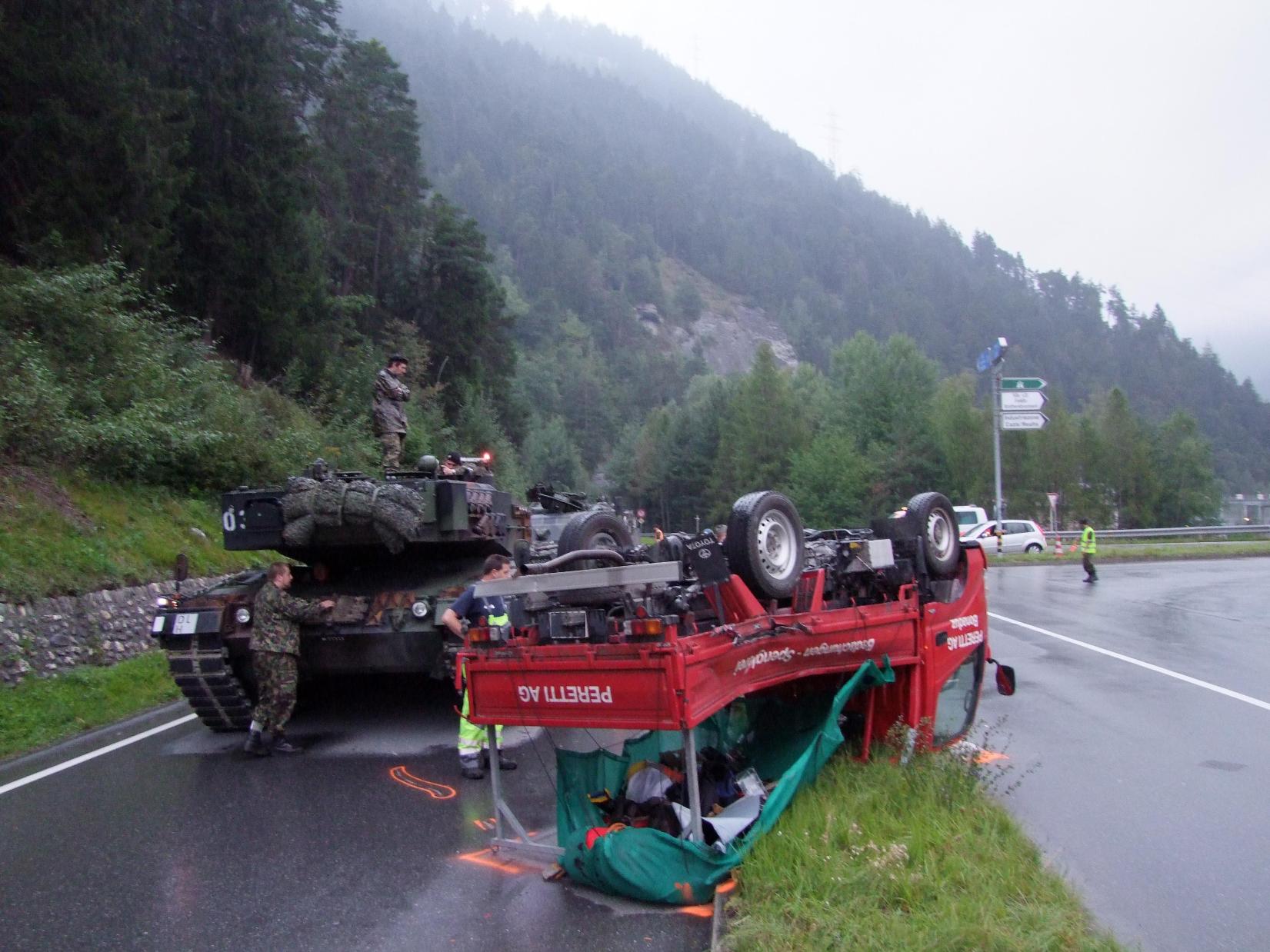 Anlässlich einer Truppenverschiebung musste eine nach Hinterrhein sich verschiebende Panzerkolonne bei Unterrealta infolge der dort durchgeführten Bauarbeiten von der A13 auf die Kantonsstrasse ausweichen. Aus Sicherheitsgründen wurde dazu der Verkehr auf der Kreuzung Rothenbrunnen-Domleschgerstrasse durch einen Armeeangehörigen geregelt. Als sich ein Leopardpanzer der Kreuzung näherte, wurde der von Bonaduz kommende und nach Rothenbrunnen abbiegende Verkehr auf der entsprechenden Einspurstrecke angehalten. Ein von Bonaduz in Richtung Thusis fahrender Lieferwagen wurde dabei offenbar übersehen und fuhr an der auf der Einspurstrecke stehenden Kolonne rechts vorbei. Gleichzeitig bog ein Panzer ebenfalls auf die in Richtung Thusis führende Fahrbahnhälfte ein. Dabei kam es zu einer heftigen Kollision zwischen dem Lieferwagen und dem Kampfpanzer in deren Folge der Lieferwagen sich überschlug und auf dem Dach liegend zum Stillstand kam. Durch die Wucht des Aufpralles wurden der Lenker und die zwei Insassen des Lieferwagens verletzt. Sie mussten von einem Ambulanzteam ins Regionalspital Thusis eingeliefert werden. Am Lieferwagen entstand Totalschaden.