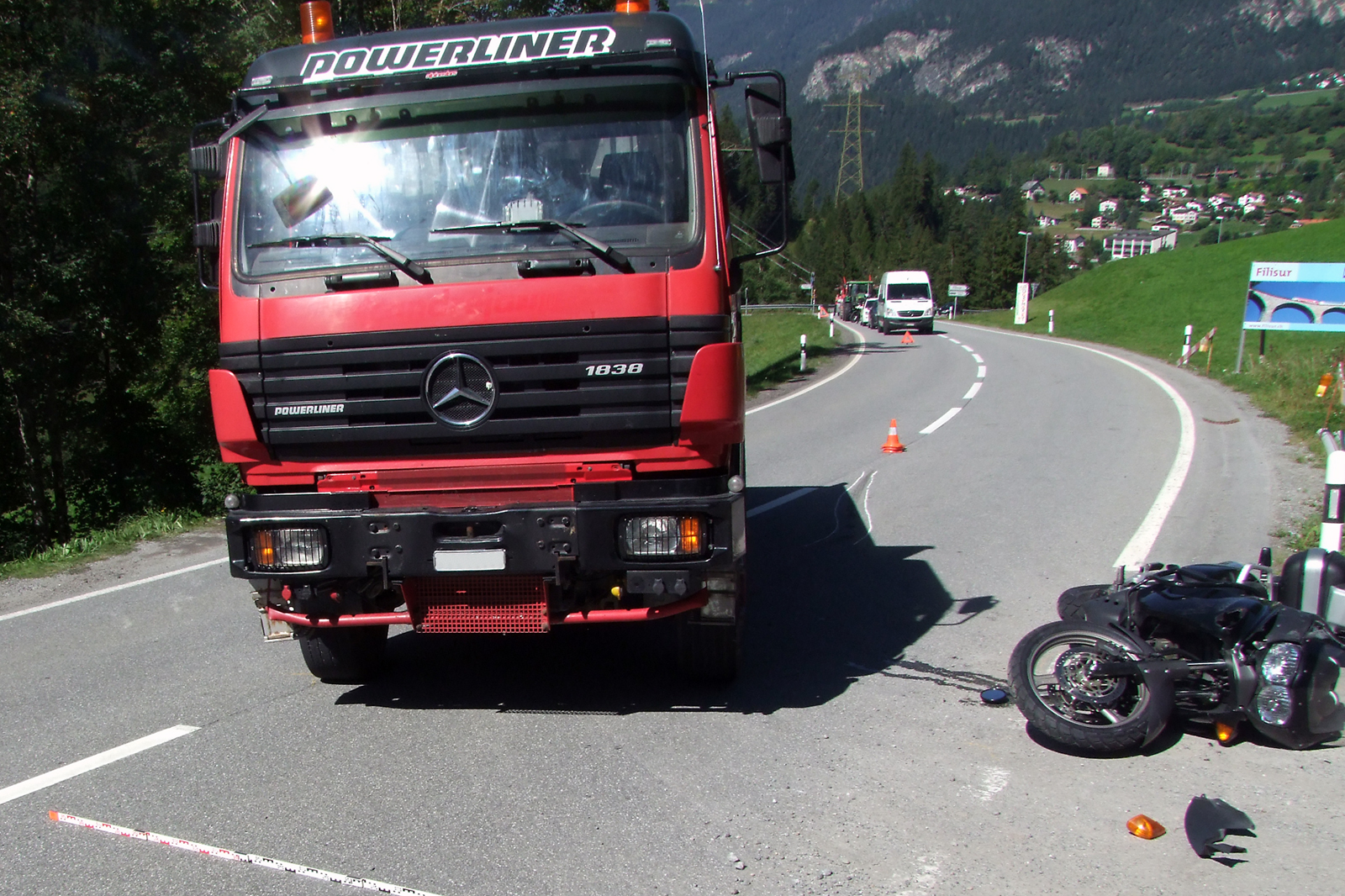 Eine Gruppe von vier Motorradfahrern fuhr auf der Albulapassstrasse von Tiefencastel in Richtung Bergün. Nach der Umfahrung Filisur schloss diese auf einen Lastwagen auf. In einer langgezogenen Rechtskurve setzte der an erster Stelle fahrende Motorradlenker zum Überholen an. Gleichzeitig bog der Lenker des Lastwagens nach links ab, um auf einen Feldweg einzubiegen. Trotz des sofort eingeleiteten Bremsmanövers kam es zu einer seitlich-frontalen Kollision zwischen den beiden Fahrzeugen. Dabei stürzte der Motorradlenker und zog sich leichte Verletzungen zu. Mit der Ambulanz wurde er ins Spital nach Thusis überführt. Das Motorrad wurde erheblich beschädigt.