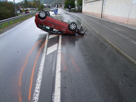 Ein von Ilanz in Richtung Disentis fahrender Personenwagenlenker geriet eingangs Trun mit seinem Fahrzeug zu weit nach rechts, überquerte das Trottoire, worauf er mit der dortigen Stützmauer kollidierte. Durch die Wucht dieses Aufpralles überschlug sich das Fahrzeug und kam auf dem Dach liegend zum Stillstand. Verletzt wurde niemand. Am Fahrzeug entstand Totalschaden.
