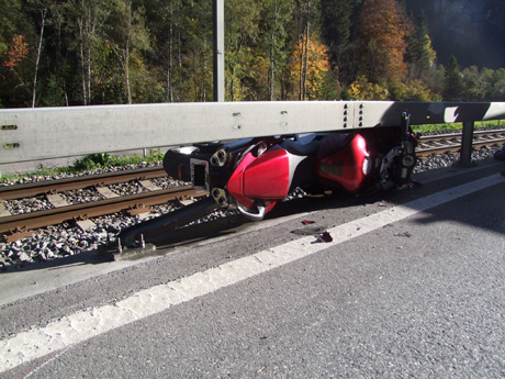 Der 56-jährige Lenker war auf der Fahrt von Landquart in Richtung Klosters, als er in einer Rechtskurve plötzlich zu Fall kam. In der Folge überquerte er die Gegenfahrbahn und prallte gegen die Leitplanke. Während sein Gefährt sich zwischen Leitplanke und Fahrbahn einklemmte, rutschte der Fahrer dazwischen durch, stürzte über die Stützmauer und kam im Wasserablauf zwischen dem Bahngeleise der RhB und der Strasse zum Stillstand. Mit mittelschweren Verletzungen wurde der Verunfallte mit der Ambulanz ins Kantonsspital Graubünden nach Chur verbracht.
