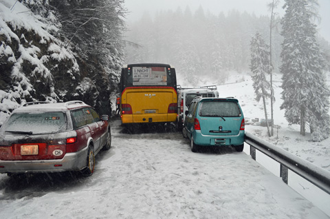 Winterliche Strassenverhältnisse und die ungenügende Ausrüstung einzelner Verkehrsteilnehmer führten zu diesen Kollisionen und Behinderungen. In einem Fall blieb der Lenker eines Lieferwagens mit seinem Fahrzeug oberhalb Churwalden stecken und rutschte rückwärts in einen nachfolgenden Personenwagen. Die beiden Fahrzeuge rutschten dann gemeinsam noch einige Meter weiter rückwärts auf das dort stehende Postauto zu. Der Postautochauffeur erkannte dies und versuchte, nach links auszuweichen. Dabei klemmte es den Lieferwagen zwischen der Leitplanke und dem Postauto ein. Als Folge dieser und weiterer kleiner Kollisionen war die Strasse zwischen Churwalden und Parpan während rund einer Stunde gesperrt.