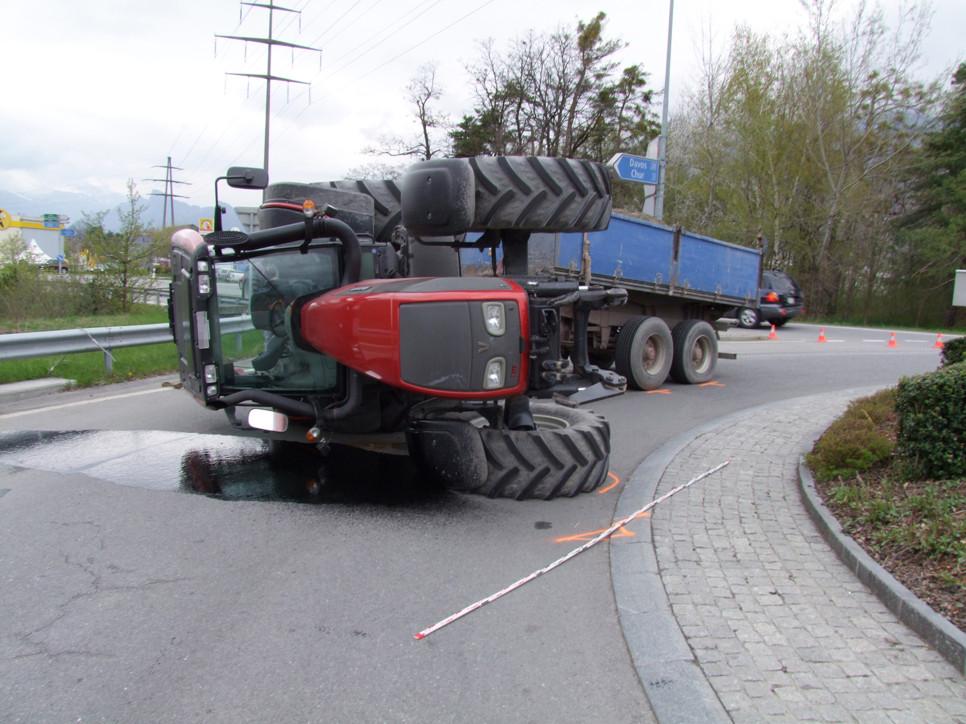 Der 26-Jährige fuhr mit seinem Fahrzeug, das einen Anhänger zog, von Chur nach Jenins. Im Karlihof-Kreisel verpasste er gemäss eigener Aussage die Ausfahrt. Aus diesem Grund wollte er den Kreisel einmal rundherum befahren. Aus noch ungeklärten Gründen kippte er kurz nach der verpassten Ausfahrt auf die rechte Seite. Der mit Aushubmaterial beladene Anhänger kippte nicht um, die Anhängerkupplung verkeilte sich aber. Dies erschwerte die Bergungsarbeiten der rund 25 Tonnen schweren Fahrzeugkombination. Der Kreisel blieb für zwei Stunden gesperrt. Der Verkehr wurde über die Nationalstrasse A28 umgeleitet. Weil aus dem Traktor Öl auf die Strasse ausgelaufen war, musste das Tiefbauamt Graubünden mit Öl-Bindemittel aufgeboten werden.