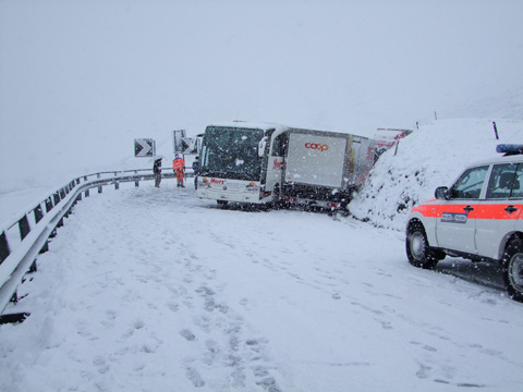 Bei starkem Schneefall blieb ein Reisecar unterhalb des Restaurants La Veduta in einer steilen Linkskurve stecken und rutschte rückwärts. Der Car kollidierte mit einem Lieferwagen und schob diesen in einen Personenwagen. Insgesamt waren vier Fahrzeuge ineinander verkeilt. Verletzt wurde niemand. An allen Fahrzeugen entstand Blechschaden. Dank der Hilfe des Bezirkstiefbauamtes Samedan konnten alle Fahrzeuge nach rund einer Stunde weiterfahren.