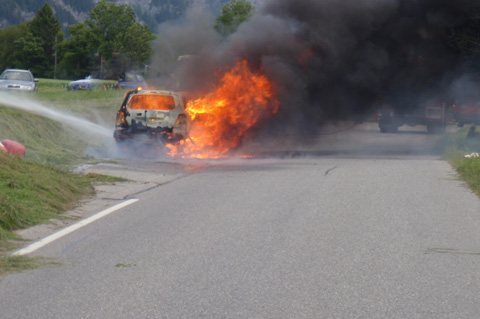 Während des Fahrens bemerkte der Lenker des Personenwagens, dass der Motor nicht mehr rund lief. Er fuhr deshalb neben die Strasse auf einen Ausstellplatz und hielt an, um nachzusehen. Als er die Motorhaube öffnete, begann es im Motorenraum zu brennen. Der Versuch, das Feuer mit einem Feuerlöscher selbst unter Kontrolle zu bekommen, misslang, weil zu wenig Löschmittel vorhanden waren. Daraufhin alarmierte er die Feuerwehr Thusis, welche den Brand löschen konnte.